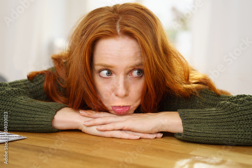 woman, disappointment, disappointed, sad, regret, countenance, anger, face, chin, red hair, home, home, interior, room, table, wooden table, recreation, adult, attractive, female, person, man, pretty, green, pullover, winter, cord, caucasian, redheadedSHARE