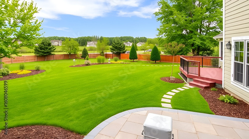 Prints and Posters: Green backyard landscape. View of house with walkout deck and pa