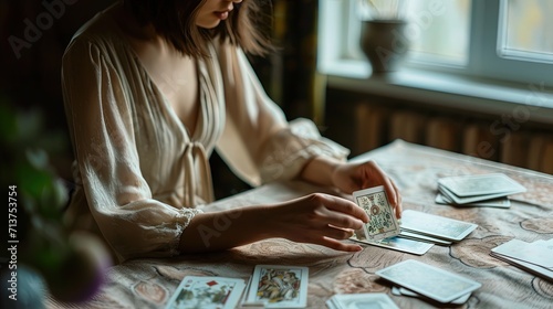 Prints and Posters: Young woman lays out tarot cards on the table, fortune telling, predicting the future. Astrology theme