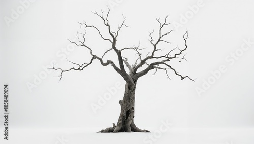 Shower Curtain: Bare branchless tree standing alone against white backdrop, highlighting erosion risk and environmental impact