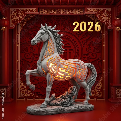 Shower Curtain: Chinese New Year Fire Horse 2026 black marble zodiac statue ceremonial art