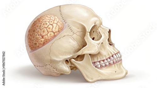 skull, bone, tumour, massa, medicals, anatomy, human, head, skull, benign, growth, illustration, section, dense, smooth, abnormal, pathology, disease, aberration, formation, condition, disorder, lesion, excrescence, development, tissue, cellular, structure, organism, biology, science, study, research, visualisation, radiology, imaging, profile, side, view, jaw, teeth, suture, organic, skeletalSHARE