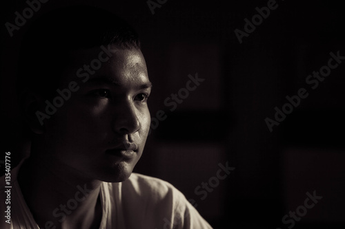 black, adult, asia, asian, background, close, closeup, dark, depression, expression, face, head, looking, male, man, 1, person, poor, portrait, profile, sad, sorrowful, serious, shadow, space, siam, thinking, white, youngSHARE