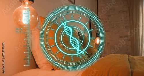 teal, pillow, deoxyribonucleic acid, helix, rotating, sleep, display, overlay, futuristic, bedchamber, ambient, spiral, bulb, semitransparent, circular, reality, ar, bed, duvet, beige, orange, accent, filament, hanging, pendant, lamp, light, brick, wall, textured, curtain, headboard, wood, metal, ring, rim, segmented, bar, tick, node, rulerSHARE