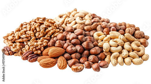 Tote Bags: Assorted nuts including walnuts hazelnuts pecan on white background.