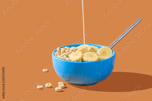 breakfast, cereal, banana, milk, pour, bowl, blue, orange, background, healthy, eating, food, morning, splash, dairy, fruit, slice, nut, grain, tableware, silverware, spoon, nourishment, meal, snack, vegetarian, fiber, cornflake, oat, wheat, muesli, granola, lifestyle, energy, calorie, diet, fresh, ingredient, epicure, simplicity, design, modern, minimalistic, concept, trendy, texture, shadowSHARE