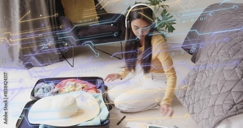 suitcase, woman, packing, notebook, kneeling, arranging, clothes, hat, earphones, futuristic, minimalist, overlay, travel, baggage, organised, clothes rack, asian, adult, student, traveler, mustard, white, casual attire, comfortable, focused, writing, sorting, stacking, placing, reaching, checklist, tablet, pen, smartphone, towel, wheeled, open, bedcover, quilted, armchair, cushion, plant, curtain, carpet, bedchamber, residential, lap, seated, digitalSHARE