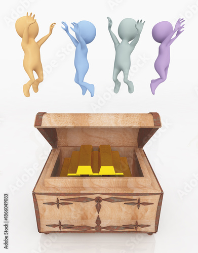Jubelnde 3D Figuren und eine Schatztruhe mit Goldbarren