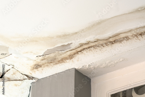 Ceiling panels with fungus outside house from water pipes damaged or rainy leaked. Office building or house problem for house service.