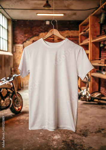 "Blank White T-Shirt Hanging in Industrial Garage with Motorcycle – Urban Street Style Mockup"