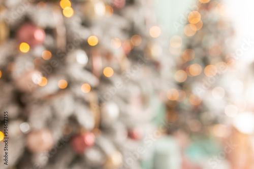Beautiful holiday decorated room with Christmas tree and bright lights , out of focus shot for photo background. Blur christmas background