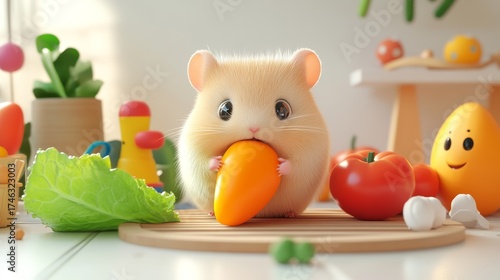 A cute hamster joyfully holds a carrot amidst colorful toys and fresh vegetables in a bright indoor playroom, capturing the essence of innocence and fun.
