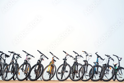 Row of bikes on the beach with misty sky background