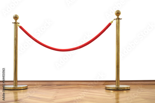 Golden barrier with red rope seamless line on the wooden floor, white background. Isolated