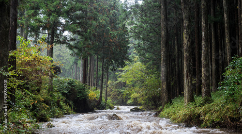 Morning light bouncing off mist and rain over mountain river flowing through woods