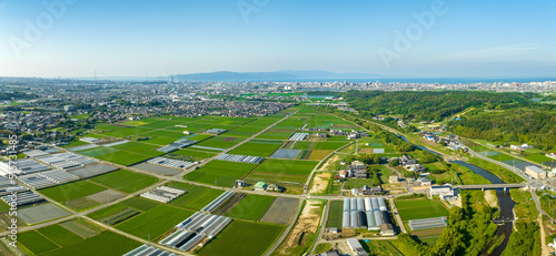 Panoramic aerial view of planted fields and greenhouses on edge of city