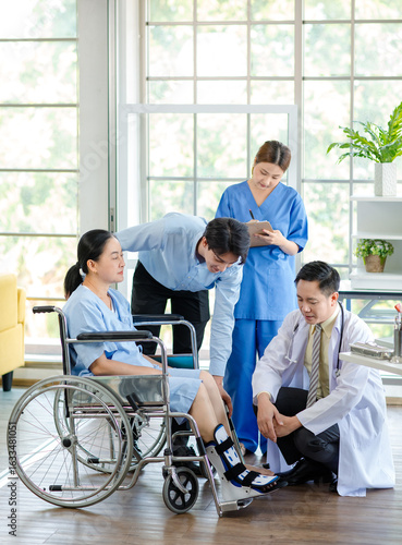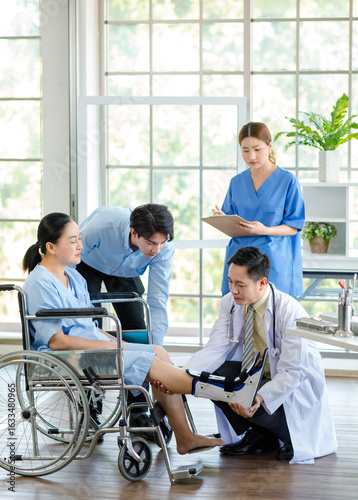 Asian doctor physiotherapy check splint leg support to senior old woman patient assisted by caregiver and nurse medical orthopedic trauma treatment team providing rehabilitation in a healthcare clinic