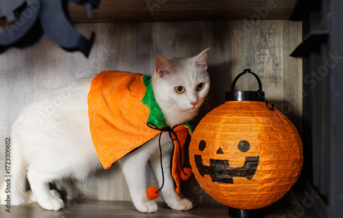 Portrait of cute white cat with yellow eyes in dressed up with funny pumpkin costume for Halloween, lying on shelf dark with props background. Pet in wizard friendly ghost carnival holiday celebration