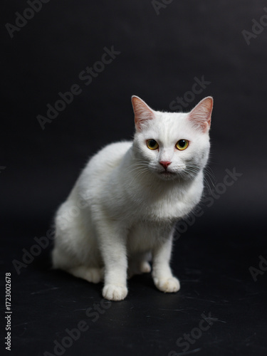 Close up portrait of cute adorable domestic animal white cat with yellow eyes sitting gazing upwards isolated on dark black background looking away. Pet happy funny care moments, friendly concept.