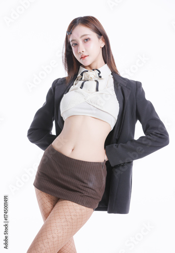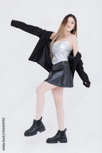 Fashion asian pretty young woman model pose playfully confident wearing silver corset top black pleated leather skirt black jacket expressing trendy streetwear style creative against white background.
