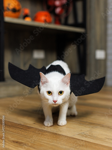 Portrait of cute white cat with yellow eyes in bat wings costume for Halloween, sitting on floor wood background. Pet in wizard happy funny moments friendly ghost carnival holiday celebration concept.