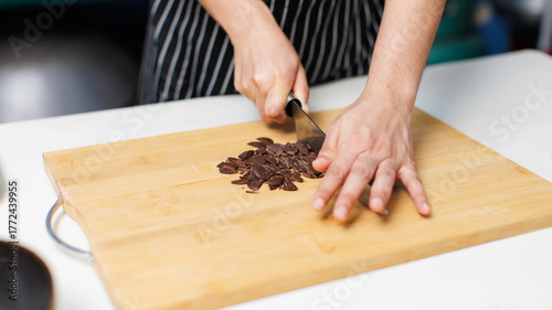 Close up hand of asian woman baker wearing striped apron chopping cutting chocolate bar with knife into small pieces on wooden cutting board process making homemade dessert baking preparing in bakery.