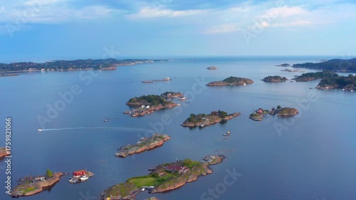 Scattered islands in archipelago fjord landscape in Norway. Sunset evening light. Summer house on remote secluded private island