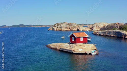 Unique tiny summer house cabin in Norway. Small single island big smooth rock or stone in the ocean. Boats and kayaks on sunny day in summer time. Aerial drone Scandinavia Norwegian Sandefjord Norway.