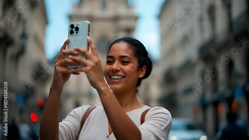 Young Woman Taking Selfie in Historic European Street with Smiling Joy