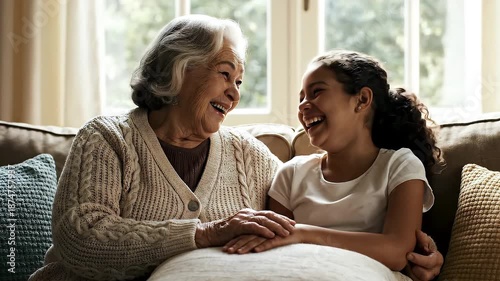 Warm Intergenerational Bonding Elderly Woman and Young Girl Laughing Together