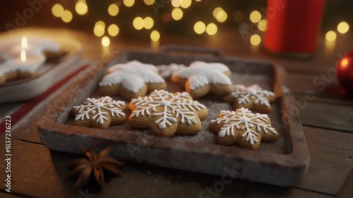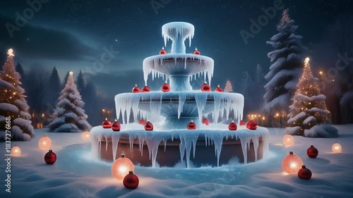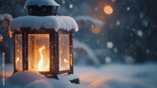 Cinematic close up of a snow covered lantern flickering softly at dusk