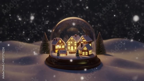 A tiny lit up Christmas village inside a glass dome, cinematic macro shot