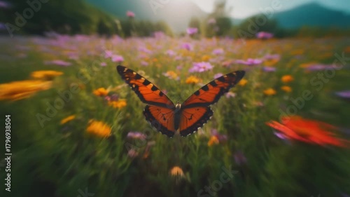 Realistic butterfly-eye perspective flying through a colorful flower field