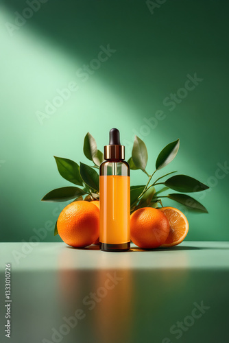 "Natural serum bottle with fresh oranges and green leaves on a minimalist background"