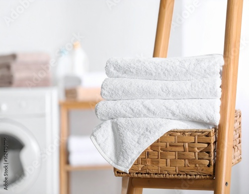 "White towel draped on a wooden ladder rack in a bright laundry room. Close-up of the towel with subtle background elements like folded linens and detergent bottles softly blurred."