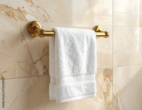 "Close-up of a neatly folded hand towel hanging on a chrome towel ring in a luxury marble bathroom. Focus on fine cotton texture, soft natural shadows, and clean neutral tones. 1:1 ratio, HD quality."