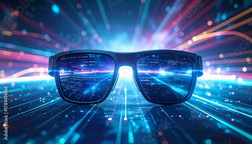 "Abstract concept of AR smart glasses technology in the future, light trails and holographic UI floating around sleek glasses, digital innovation theme, high detail, cinematic lighting"