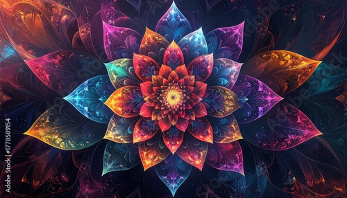 "Digital abstract flower art with fractal-inspired petal patterns, symmetry, and luminous neon gradient colors, high-tech yet organic"