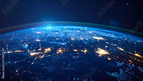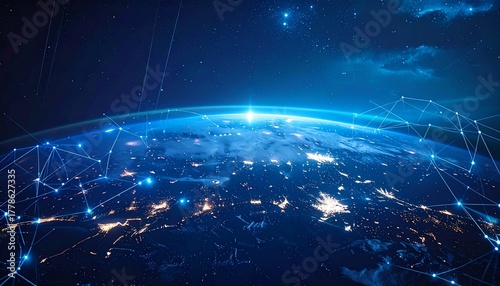 "Abstract business technology concept with glowing data connections, polygonal network lines, and a sense of global communication, dark navy backdrop"