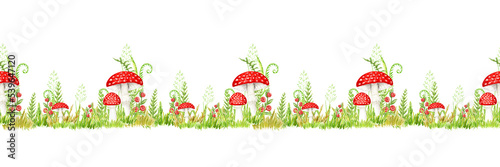 Amanita muscaria watercolor seamless border, Fly agaric mushroom with grass. White spotted toxic red mushrooms. Hand drawn Illustration on transparent background png