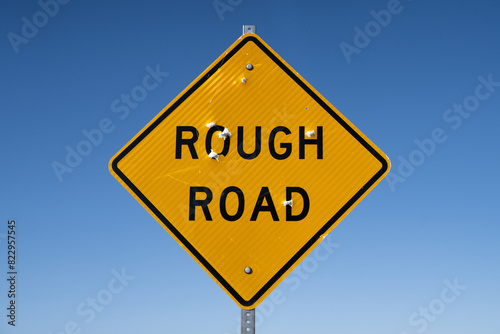 "Rough Road" sign with bullet holes in remote desert area. Blue sky background.