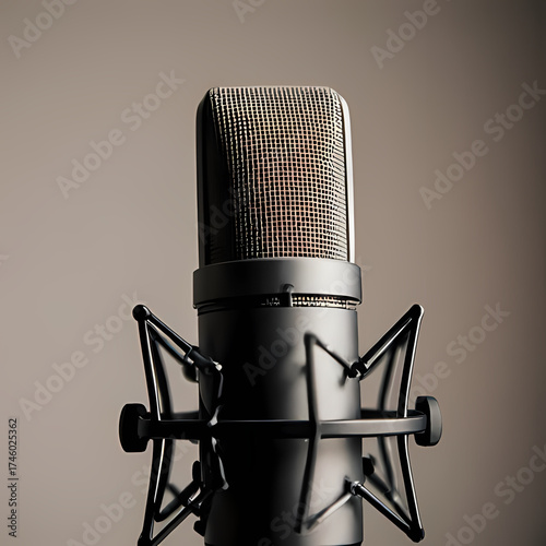 Close-up of a podcast microphone with soft lighting on a neutral background.