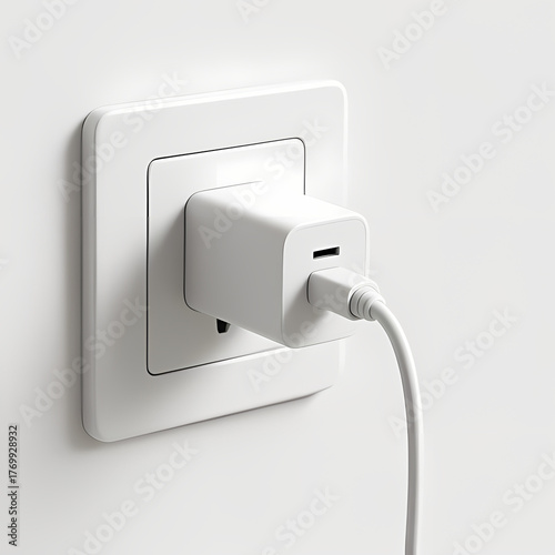 3D render of a phone charger plugged into a wall socket on a clean white wall background