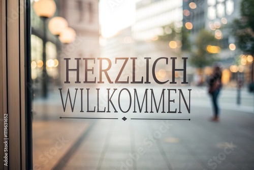 "Herzlich Willkommen" text on a glass door with a blurred urban street view, symbolizing hospitality and modern welcoming culture.
