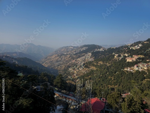Wide panoramic view of Shimla valleys and forested hills dotted with houses, captured on a bright day highlighting elevation, depth, and natural contours.