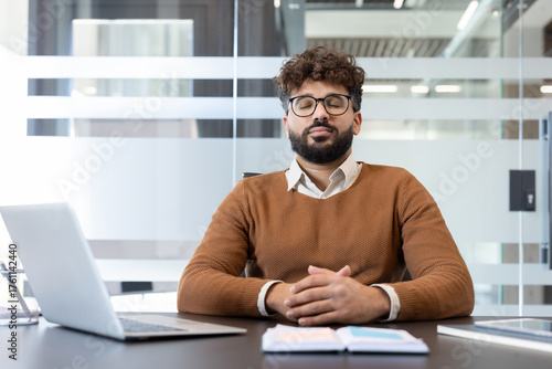 Young man meditating at his office desk, eyes closed and breathing deeply to relieve stress, promote mindfulness and calm during a busy workday in a modern workspace