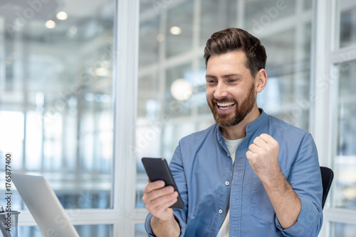 Happy businessman pumps his fist in celebration while reading excellent news on his smartphone in a modern office, beaming with excitement and professional satisfaction