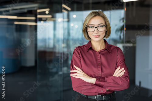 Professional businesswoman standing confident and smiling with arms crossed in a modern office, representing success, management, and corporate leadership