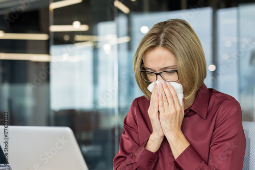 Young woman feeling unwell and blowing her nose with a tissue while working at her desk in a modern office, experiencing symptoms of cold, flu, or seasonal allergies