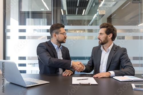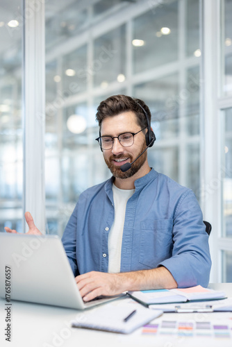 Man wearing a headset and spectacles is communicating during a video call on his laptop from a modern office, actively participating in an online meeting or providing customer support